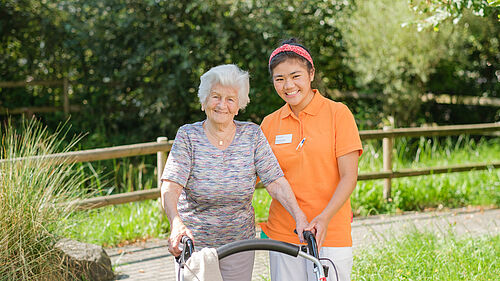 Berta Kost-Duss und Tingle Bhutsang, Assistentin Gesundheit und Soziales (AGS) im zweiten Ausbildungsjahr, kommen vom gemeinsamen Spaziergang zurück. Sie setzen sich draussen in der Cafeteria unter den Sonnenschirm. Im Gespräch erklärt Berta Kost-Duss, warum sie den Wunsch hatte, in die Alterssiedlung zu ziehen: «Bis vor zwei Jahren konnte ich in meiner eigenen Wohnung leben. Nach mehreren Stürzen fühlte ich mich allerdings nicht mehr sicher und wollte deshalb hier im Unterfeld einziehen. Gesundheitlich