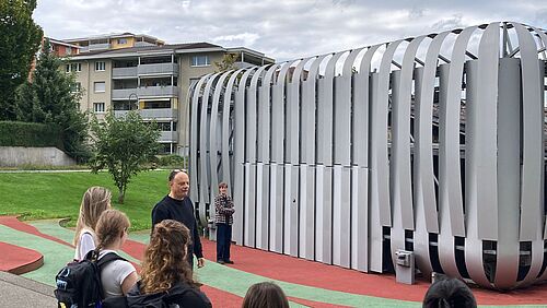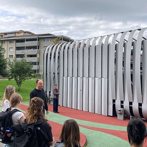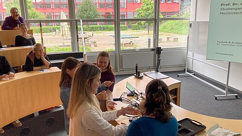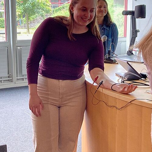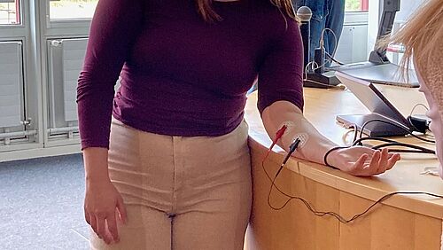 Zum Auftakt des Besuchs wurden wir mit einem eindrucksvollen Demonstrationsgerät begrüsst, das Muskelkontraktionen von einer Person auf eine andere übertragen kann. Zwei Studierende führten das Prinzip anschaulich vor: Eine Person kontrahierte ihren Unterarm, indem sie eine Faust machte. Das dabei erzeugte elektrische Signal wurde über das Gerät auf eine zweite Person übertragen – und tatsächlich kontrahierte auch deren Hand. Fast schon Magie!