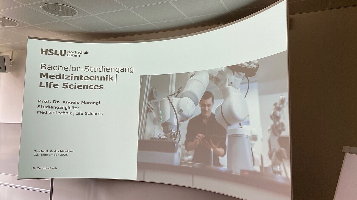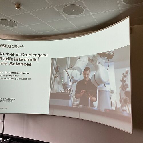 Im Anschluss stellte uns Prof. Dr. Angelo Marangi (Studiengangleiter) den Bachelorstudiengang Medizintechnik / Life Sciences vor und führte uns virtuell durch die modernen Schulungslabore in Hergiswil. Die Einblicke in die praxisnahe Ausbildung und die Infrastruktur waren beeindruckend.