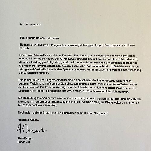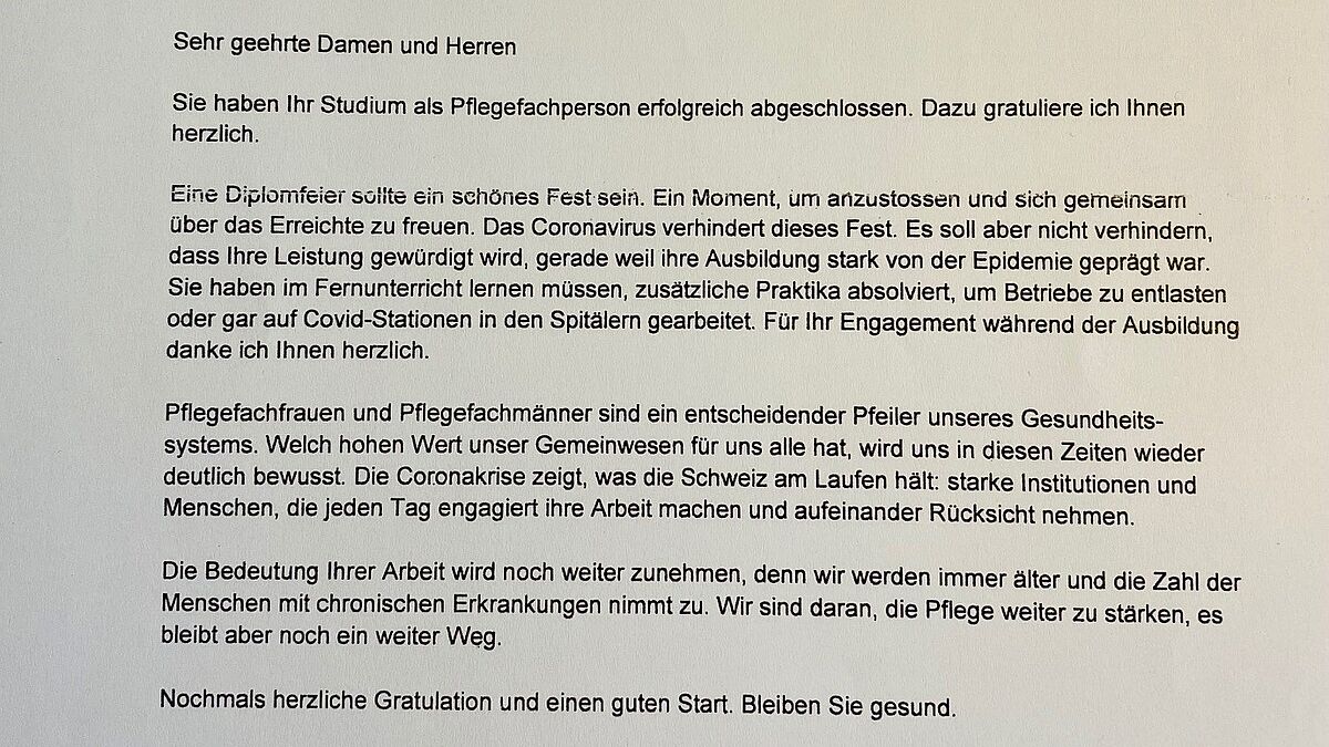 Bundesrat Alain Berset höchstpersönlich gratulierte den Diplomanden mit einem Brief zur abgeschlossenen Ausbildung. Zurecht, denn die Ausbildung der glücklichen Diplomanden war stark von der Corona-Pandemie geprägt und fand zum Teil im Fernunterricht statt. Berset betont in seinen Zeilen, dass Pflegefachfrauen und Pflegefachmänner ein entscheidender Pfeiler unseres Gesundheitssystems sind. «Die Coronakrise zeigt, was die Schweiz am Laufen hält: starke Institutionen und Menschen, die jeden Tag engagiert ihre Arbeit machen und aufeinander Rücksicht nehmen.»