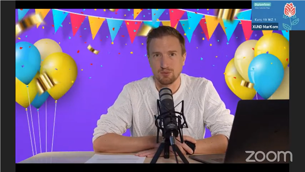 Den witzigen Schlusspunkt der virtuellen Feier setzte Comedian Stefan Büsser mit einer Videogrussbotschaft. Auch er gratulierte den Diplomanden zu ihrem sinnvollen und erfüllenden Beruf und bedankt sich persönlich für die Arbeit, die aktuell unter nicht nur einfachen Bedingungen geleistet wird.