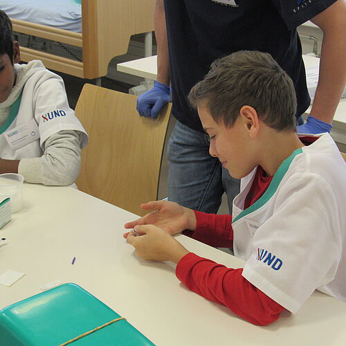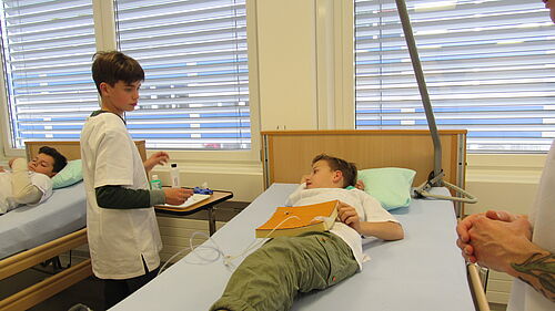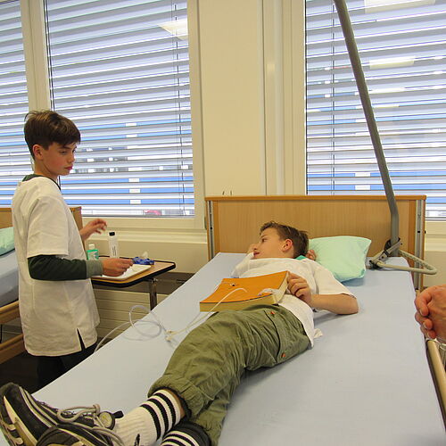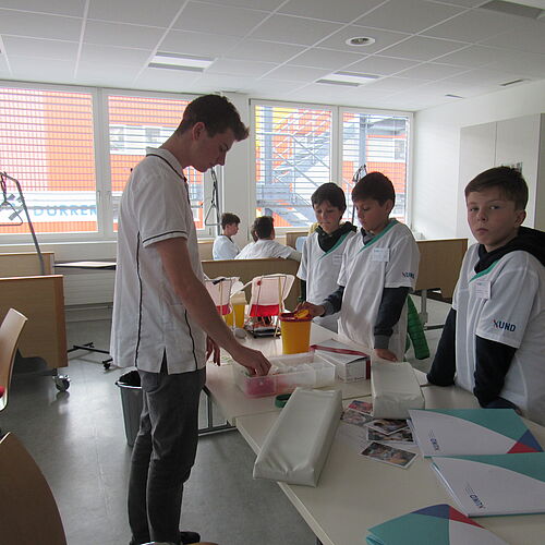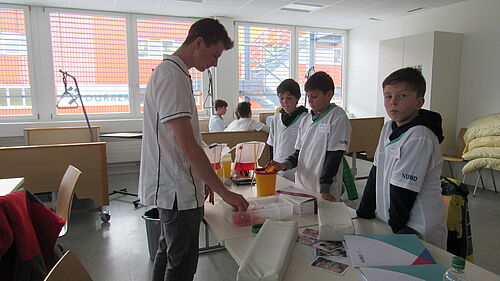Während einem Tag erhalten 15 Schüler einen Einblick in die Pflege. Unter Aufsicht von Roberto Emmenegger, Bildungsverantwortlicher von XUND und unter Anleitung von drei Lernenden FaGe üben die Jungs verschiedene Aufgaben der Pflege: