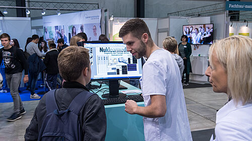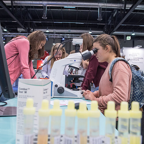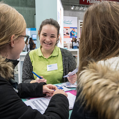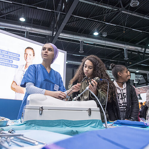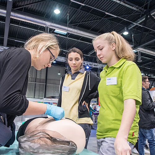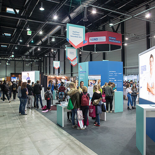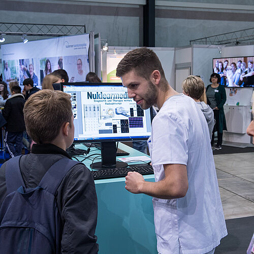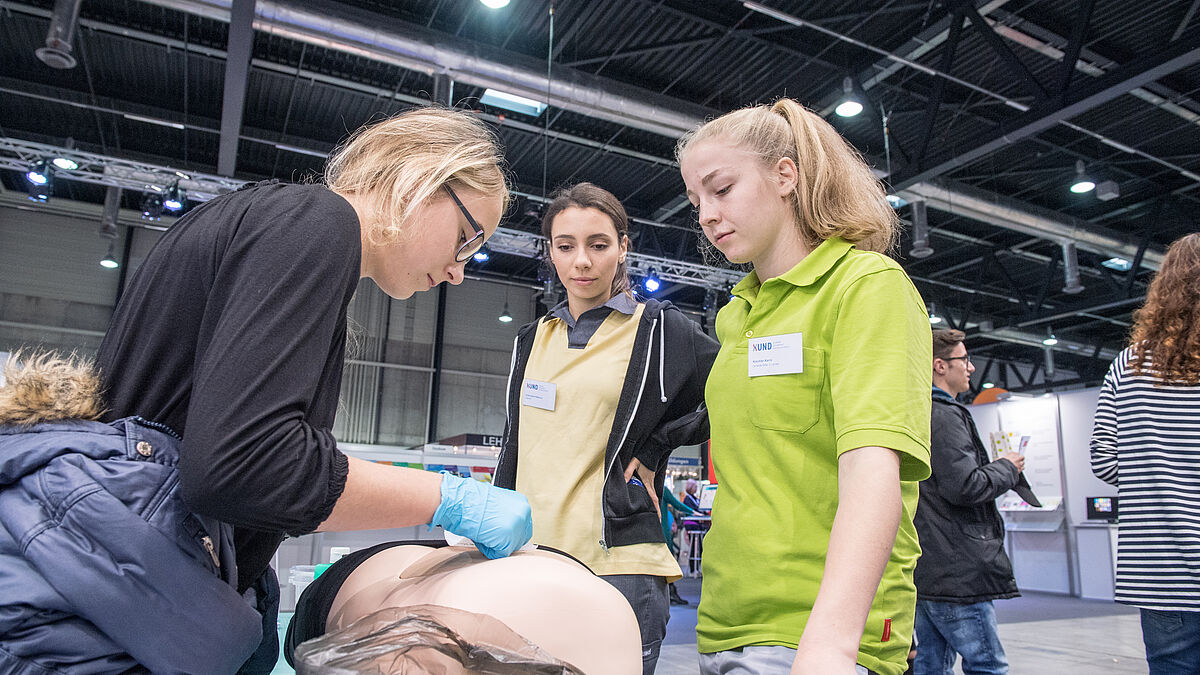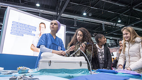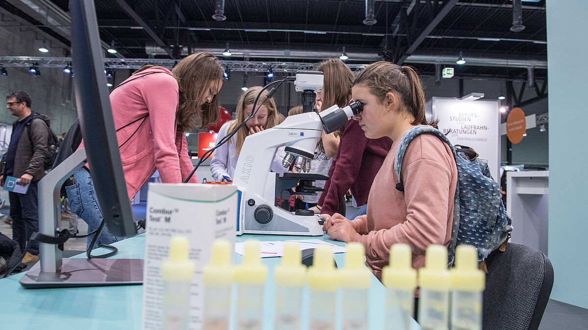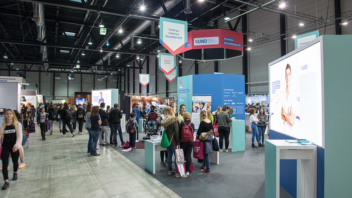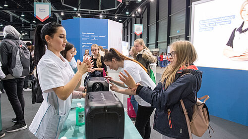 X-Klassen strömten heute Morgen um neun Uhr in die Halle zwei der Messe Allmend. Es ist wieder Zebi-Zeit (Zentralschweizer Bildungsmesse). Der XUND-Stand ist bereit für den Ansturm. Rund 20 Fachpersonen stellen sechs verschiedene Gesundheitsberufe vor - mehr noch, sie assistieren, wenn die Schülerinnen und Schüler selber ihre Hände richtig desinfizieren, einen Wundverband wechseln, Bakterien unter dem Mikroskop analysieren oder Sugus herausoperieren. Ganz unter dem Motto: Gesundheitsberufe erleben.