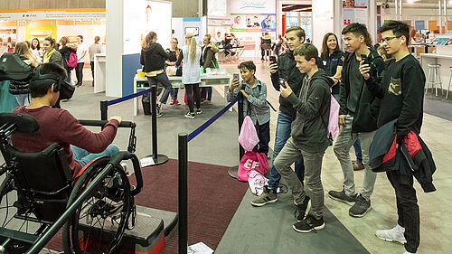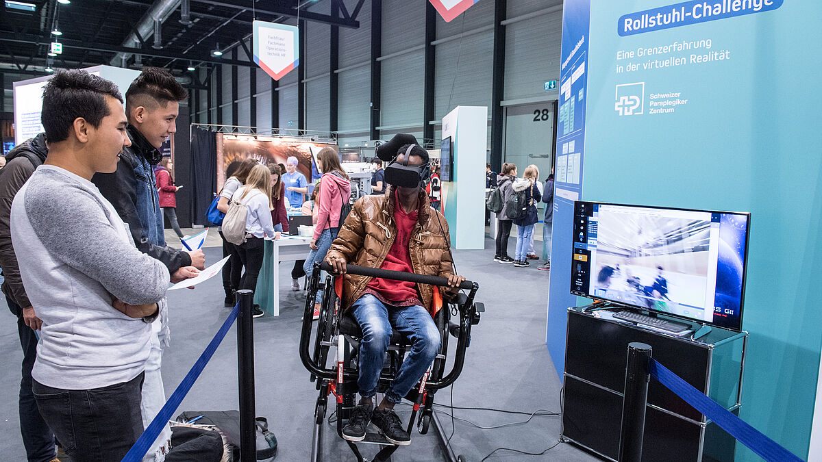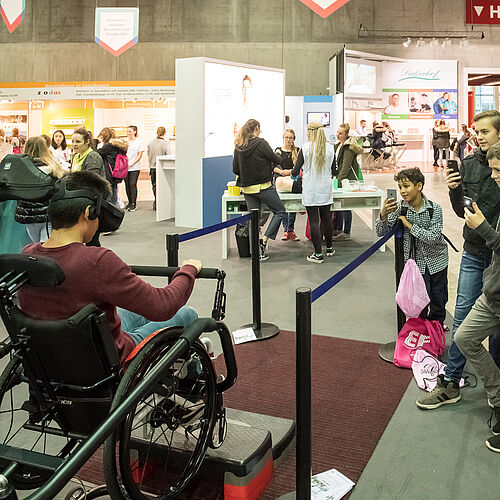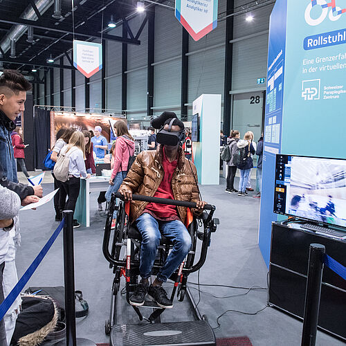 Eine ganz besonderes Erlebnis bietet dieses Jahr auch die Rollstuhl-Challenge des SPZ. Hier erfahren die Messebesucher in der virtuellen Realität wie es ist, wenn man plötzlich querschnittgelähmt ist.