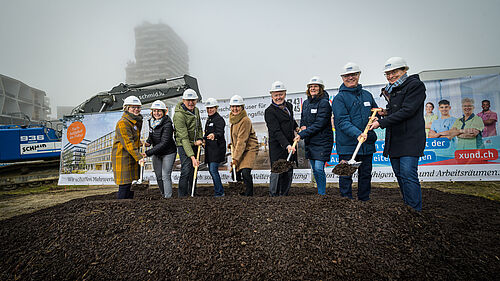 Foto Spatenstich (v. l. n. r.: Madeleine Scheidegger, Bereichsleiterin Praxistraining XUND; Barbara Michel, Bereichsleiterin Human Resources XUND; Adrian Wyss, Bereichsleiter Weiterbildung & Entwicklung XUND; Anett Neubert, Präsidentin OdA XUND; Frau Landammann Silvia Thalmann-Gut, Vorsteherin Volkswirtschaftsdirektion des Kantons Zug; Josef Widmer, Präsident Bildungszentrum XUND; Rahel Stöckli, Bereichsleiterin Pflege HF XUND; Jörg Meyer, Strategische Projekte für Präsidium XUND; Jutta Klein, Co-Leiterin XUND)